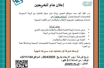 كلية الغد للعلوم الطبية التطبيقية بجدة تقيم ورشة عمل بعنوان “دعم وتثقيف خريجي الجامعات”بالتعاون مع الهيئة السعودية للتخصصات الصحية